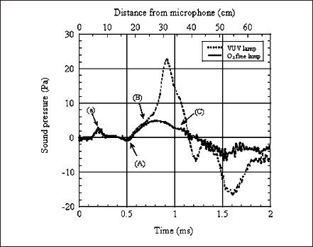 We can see that the sound pressure wave forms of the VUV lamp separate from the 3 free lamp after point(B). This separation seems to be caused by the spectral difference of these two lamps.