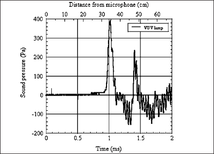 The sound pressure wave form of the VUV lamp without the outer tube is shown in Fig. 3. The wave form with 400 Pa maximum sound pressure appeared at a few centimeters from the lamp, but this peak could not be observed on the wave form of the O3 free lamp without the outer tube. As the characteristic of the mechanical vibration does not vary with the tube materials of those lamps, it is suggested that some gas species of the larger absorption coefficient were the origin of the audible frequency component with the VUV lamp.