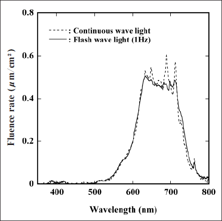 Flash wave (FW) and continuous wave (CW) xenon lamps (CF-40F, Nissin Erectronic Co., Ltd. and UI-501C, Ushio Inc.) were employed as light sources. The irradiation frequency and the pulse width of the FW light were in the range of 1-32 Hz and less than one millisecond, respectively. A UV and IR cut filter (Super Cold Filter 750, Asahi Spectra) and a red filter (302, OCLI) were used. The spectral output of the FW and the CW light was measured with a spectroradiometer (USR-40, Ushio Inc.).