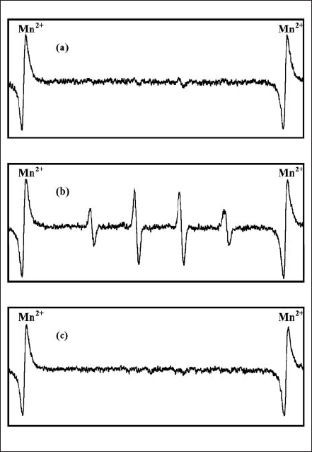 Fig. 3. ESR spectra of PpIX and DMPO mixed solution (a) before light irradiation; (b and c) after FW light irradiation (4Hz) for 4h without and with histidine.