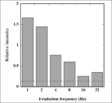 We further calculated the relative intensity (RI) value of the ESR signal of DMPO-OH adduct against the signal of manganese (Mn2+) marker on both sides of the ESR signals. Here, increasing RI value means increas ing generation of 1O2. Figure 4 depicts changes in RI value as a function of irradiation frequency of the FW light. The RI value in the irradiation of the FW light was larger than that of the CW light (dashed line); additionally, this value drastically increased with decreasing irradiation frequency. These results signify that the FW light is superior to the CW light for generating 1O2, especially at lower irradiation frequency.