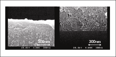 Figure 2: Cross-sectional SEM images for an ngp-Si film in top and bottom areas. Small grains with diameters of several ten nm are seen in both parts.