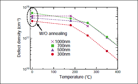 Figure 3 shows HPWVA temperature dependence of defect density of ngp-Si films with various thicknesses performed for 1 hour under 0.2 MPa. The defect densities, initially around 5 x 1017 /cm3, can be effectively decreased down to around or lower than 1 x 1016 /cm3 when HPWVA temperature increases up to 350 °C. This result also shows that the defect density of ngp-Si after HPWVA is sensitive to temperature, which is probably because diffusion of terminating atoms into ngp-Si are enhanced and thus defects located far from the surface start to be terminated.