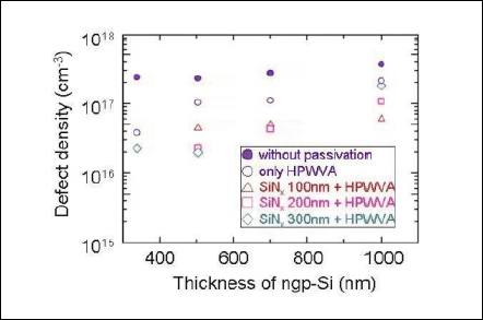 Figure 4 indicates defect density of ngp-Si films with various ngp-Si and SiNx film thicknesses. HPWVA performed at 350 °C under 0.2 MPa. Drastic reduction of defect densities occurs for all the ngp-Si films when Si films are capped by SiNx films. The defect density can be decreased down to 2 x 1016/cm3 for ngp-Si films with a thickness of 500 nm and to 6 x 1016 /cm3 even for 1000 nm-thick ngp-Si films. This indicates that desorption of hydrogen atoms in Si films during RTA has been effectively suppressed by SiNx film capping. There may be another effect that hydrogen atoms contained in SiNx films diffuse into ngp-Si films and terminate dangling bonds in them during RTA.