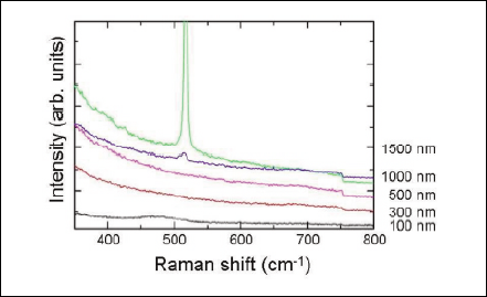 Figure 5: Raman spectra for Si films with various thickness after millisecond annealing. Gradual increase of each spectrum in small wavenumber region indicates Rayleigh scattering.