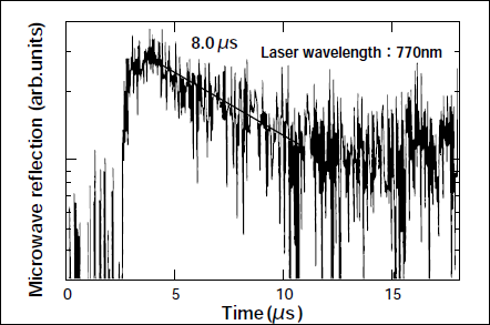 Figure 4 shows a decay curve of microwave reflection measured by µ-PCD for this strongly irradiated 1.5µmthick ngp-Si film to which HPWVA has been treated. Amazingly long minority carrier lifetime of 5-10µs is seen. This long carrier lifetime can be reproduced only when crystallinity of a poly-Si film is sufficiently high, that is, lamp irradiance is sufficiently strong. Assuming minority carrier mobility of 10cm2/Vs, the diffusion length can be estimated to be over 10µm using equations of L = (Dτ)1/2 and D/µ= kT/q, where L, D, τ, µ represent minority carrier diffusion length, diffusion coefficient, lifetime and mobility, respectively. This minority carrier diffusion length is much longer than the film thickness. Without PWVA treatment, such significant signals cannot be seen, which is probably because minority carriers generated by a laser pulse are immediately annihilated due to a large number of unpassivated defects. Therefore, this result also indicates that HPWVA is essential for forming high-quality ngp-Si films with long minority carrier lifetime.