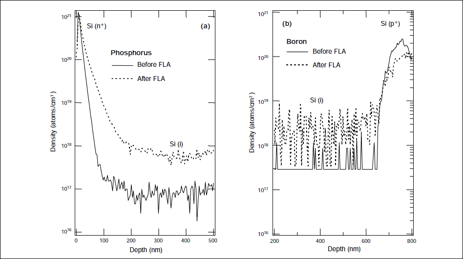 Fig. 5 SIMS profiles for (a) phosphorus and (b) boron atoms before and after FLA.