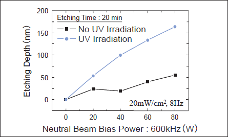 Figure 3 shows the dependence of the etching depth on the photon irradiation power density (wavelengths from 200 to 380 nm) in the same neutral beam conditions (same beam energy and flux). The RF bias power for controlling the neutral beam energy was fixed at 60 W (etching time: 20 min). The Si etching depth increased dramatically with the photon irradiation power when the power (wavelengths from 200 to 380 nm) was greater than 6 mW/cm2. We first found that a photon irradiation power density over 6 mW/cm2 was particularly effective in enhancing surface reactions between Cl and Si.