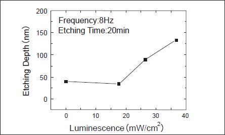 Fig.3: Dependence of etching depth on photon irradiation power (wavelengths from 200 to 380 nm) in same neutral beam conditions (beam energy and flux).