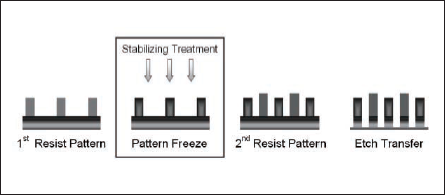 Fig.1 : Double imaging schematic. Application and patterning of a second resist film over a pre-existing, first resist pattern requires a stabilizing treatment.