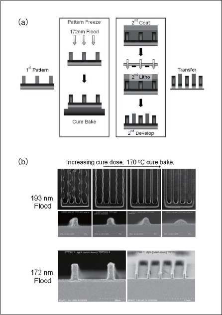 Fig.2: (a) Double imaging schematic using 172nm stabilization. In this study, the 172nm exposure is followed by a post-flood exposure cure bake to fully stabilize the first resist pattern. (b) Resist profile comparison following 193nm and 172nm stabilization. Images are for resist features that have been stabilized by flood exposure and 170t bake, then re-exposed at 193nm and re-developed to mimic parts of the second resist process. For 193 nm stabilization, swelling during second development cannot be suppressed without causing resist reflow. 172 nm stabilization can suppress swelling without causing reflow.