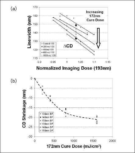 (b) ΔCD vs. 172nm cure dose for a range of line/space target dimensions.