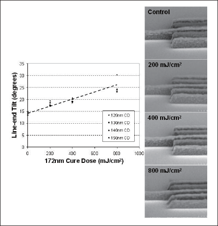 Fig. 4 illustrates the behavior of line ends following 172nm stabilization. As 172nm dose increases, line end tilt becomes more pronounced. In order to analyze these images semi-quantitatively, we have applied a simple geometric SEM tilt perspective correction. We recognize that SEM image distortions may not be fully compensated for in this manner. Nevertheless, this method allows much better comparison of dose-dependent line end tilting than can be inferred from top-down SEM analysis. At 800 mJ/cm2, line ends are tilted by approximately 25 degrees.