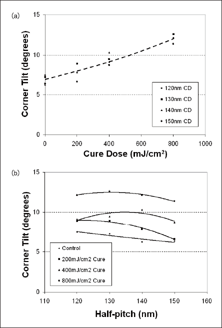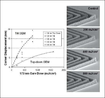 Outer corner tilt vs. 172nm stabilizing dose for elbow features ranging in line/space half-pitch from 120 to 150nm is shown in fig. 7. Corner tilt increases with stabilizing dose, but shows little dependence on CD or pitch for the features studied here.
