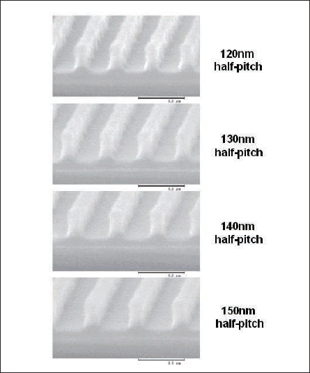 Fig.9: Cross-sectional profiles of resist features following 800mJ/cm2 172nm exposure,170°C bake,and proxy 2nd development. Under these conditions, resist profiles are successfully preserved.