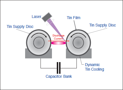 In LDP the plasma is generated between two rotating discs, see Figure 2. Partially immersed in baths filled with liquid tin, the discs are wetted and covered with a thin layer of liquid tin. A pulsed laser beam focused on one of the discs evaporates a small amount of tin and generates a tin cloud between the two discs. Next a capacitor bank, which is connected to the discs via the liquid tin, discharges and converts the tin cloud into a plasma. Pinched by the high current the plasma emits the EUV radiation. This process is repeated several thousand times per second. The resulting heat-load is cooled away by the liquid tin, which is kept at constant temperature by an external cooler.