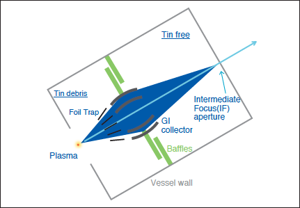 To focus the produced EUV light into the scanner, a grazing incidence collector mirror5 is used, see Figure 3. Because all tin plasmas generate tin debris in the form of droplets, clusters, neutrals and ions, it is critical to protect the highly sensitive EUV optics.