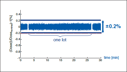 Figure 6: Measured integrated dose stability during simulated scanner operation. In this example a real exposure scenario was simulated over 30 minutes.