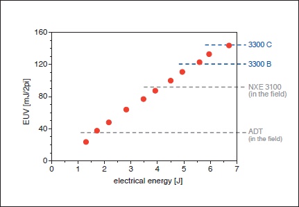 Figure 9: Linear dependence of the output energy per pulse in dependence on the electrical pulse input energy for the different source generations alpha demo tool (ADT), pre-production (NXE 3100) and HVM (NXE 3300 series)