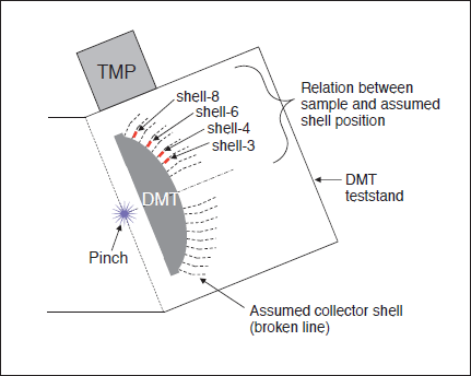 Figure 1 shows a setup of test stand for DMT development. Tin DPP source was connected to the test stand. TMPs were also installed and evacuated a buffer gas to be the same chamber pressure for SoCoMo. Total pumping speed was smaller than that of SoCoMo. Therefore, the buffer gas flow rate was also small. A special sample holder was installed to this test stand. The sample positions were corresponding to actual collector shell surface of SoCoMo. Sample piece was about 1cm2 of a ruthenium coated silicon plate. In each condition, discharge pulses were about 100 Mshots.