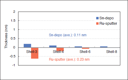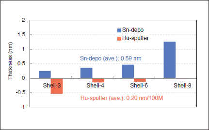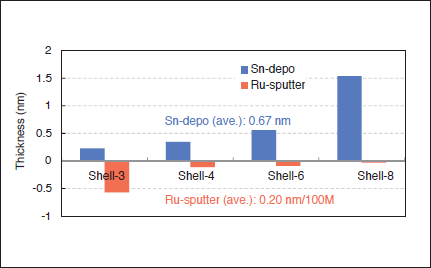 To evaluate the sample before and after experiment, X-ray fluorescence analysis (XRF) was used to determine an average thickness of ruthenium and tin on sample. The results are shown in Figs 2 to 4. A vertical axis of the graph is shown the thickness. For example, when that takes a plus (positive) value, it means that tin is deposited on sample. When that takes a minus (negative) value, it means that ruthenium coating is sputtered on sample.