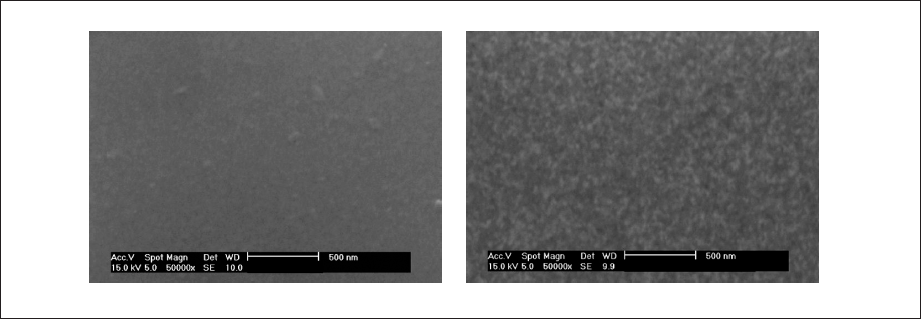The sample surface was analyzed by SEM. Figure 5 shows two representative regions after about 100 Mshots (3rd setup). The sample was a ruthenium coated silicone plate. The small dark and bright region of these SEM image were the columnar structure of ruthenium at the top surface. They can also see a sample before experiment. Although some tin deposition and ruthenium sputtering could be found by XRF, there were no significant changes between before and after the experiment with SEM analysis.
