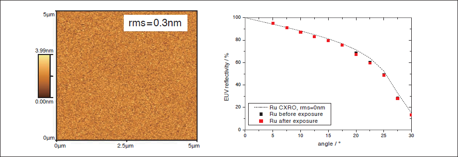 The surface roughness was measured by AFM. And EUV reflectivity was measured by a reflectometer with xenon EUV source. Figure 6 shows them for the sample of 3rd setup. The measured roughness was 0.3 nm. And it had no significant change compared before experiment. Also EUV reflectivity had no change. Therefore, there was no influence caused by ruthenium sputtering.