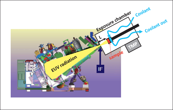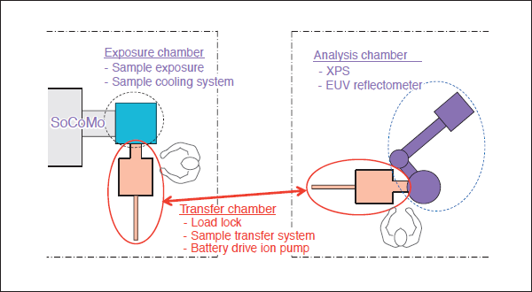 A clean photon is required for SoCoMo to connect a scanner. Because SoCoMo and scanner have been coupleddi rectly in EUVL. An experimental setup as shown in Fig. 7 was used to evaluate contaminations from SoCoMo. A sample which was a multilayer Mo/Si mirror piece was installed at 100 mm or 200 mm behind IF to expose with EUV radiation. To avoid an overheating of sample by the radiation, the sample holder was cooled by coolant circulation from the atmosphere side. With this cooling system, its surface temperature would be kept less than 60 °C. A sample exposure chamber was attached behind IF and it was evacuated by TMP. Then the exposure chamber pressure was around 10-3 Pa. EUV reflectivity and X-ray photoelectron spectroscopy (XPS) were used to evaluate contaminations on the sample. It is known that mirror optics is degraded by oxide and/or carbon for a scanner side. In the atmosphere, a lot of oxygen and carbon are existed. To measure the only deposited oxide and carbon in the chamber, the sample should be handled without breaking vacuum. For this experiment, we developed and used a quasi in-situ measurement system to detect them [1]. Figure 8 shows the schematics of our measurement system.