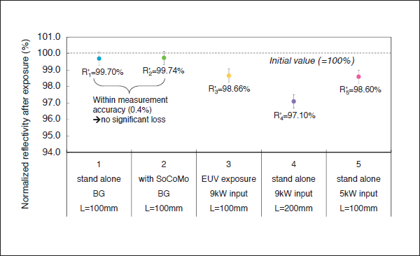 Experimental results are shown in Fig. 9. A vertical axis is a normalized reflectivity. For each experiment, an initial reflectivity was defined to 100%. And a horizontal axis is an experiment number and condition. 1st and 2nd experiments were measured for each background without EUV condition. For background measurements, there was no significant loss. 3rd to 5th experiments were measured with EUV radiation. In these cases, the reflectivity was dropped a little. After exposure, oxygen and carbon peak intensity of XPS were also changed. Therefore, the reflectivity loss is caused by the deposition of carbon and/or oxide. This phenomenon is well - known degradation me chanism for multilayer mirror that are exposed to EUV. For 3 different exposure conditions, the reflectivity was also different. It would be due to some complicate effects which are distribution of contamination in the exposure chamber, intensity of radiation from pinch, a sputtering of EUV driven plasma etc. To explain them, we will need more investigations. However, note that the mirrors will be protected against these phenomena in a real EUV scanner, which are mentioned into some patents etc. [3, 4]