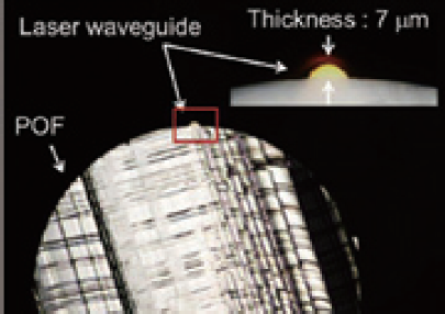 As shown as Fig.5 a spiral laser waveguide on POF was demonstrated. It was shown that three-dimensional waveguide can be fabricated in width of 40µm on a cylindrical surface. Moreover various-shaped laser waveguides can be fabricated on POF by using this equipment. This waveguide is considered in the use a samp of whispering-gallery or continual twist sensor. This waveguide is considered in the use as amp of whispering-gallery or continual twist sensor.