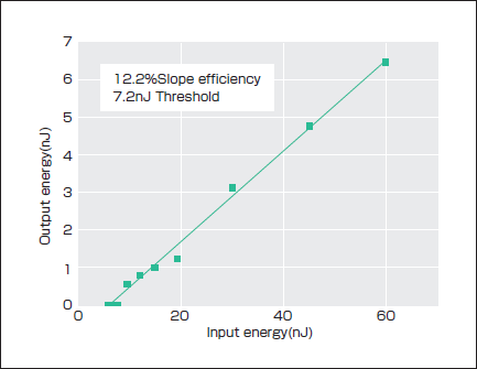 When the propagating pumping beam pulse reached to the DFB laser mounting point, the propagating pump-beam was partially coupled to the DFB laser waveguide with leaky propagation mode. Since the tapered couplings were fabricated on the both ends of the waveguide, the laser output can be coupled to the POF in forward and backward directions. The DFB laser output was monitored in the forward direction. The slope efficiency can be estimated as 12.2%, and the laser threshold around 7.2nJ was estimated.