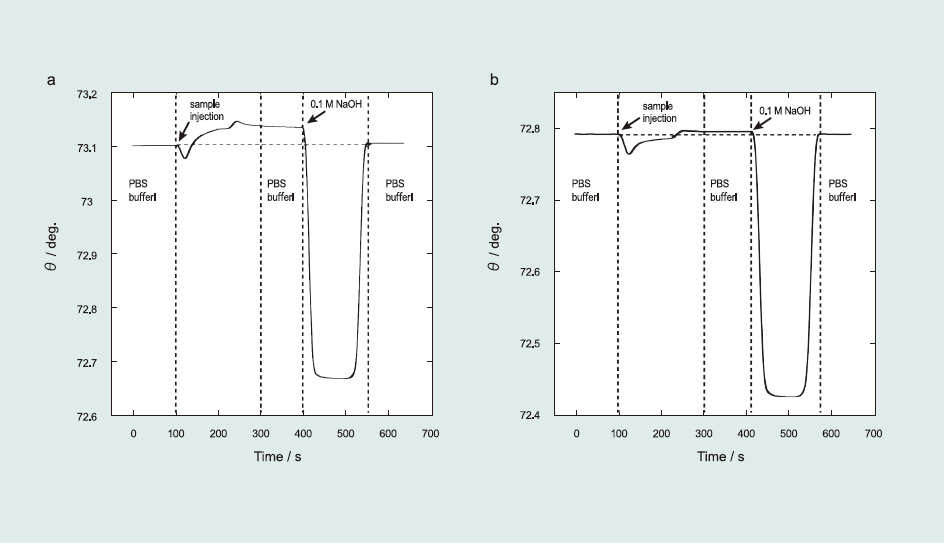 SPR experiments were conducted on an SPR-670 instrument (Nippon Laser Electronics, Japan), equipped with a completely automated flow system comprising a plunger pump and an injector. The Au chip was mounted on a semicylindrical prism with a refractive-index-matching liquid. Red light (670 nm) emitted from a Ni–Cd laser was reflected at the Au-coated glass plate at attenuated total reflection angles, and the reflected light intensity was recorded using a charge-coupled device camera. The reflectance angle, at which the light intensity was minimum (SPR angle), was recorded with time. All the experiments were conducted in an air-conditioned room (i.e., 25 °C).