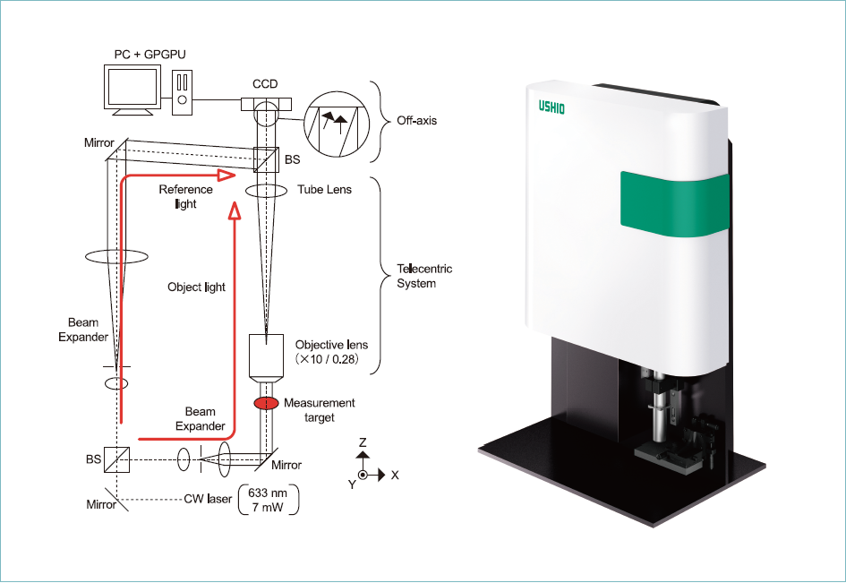 Fig. 1 Optical design (left) and photograph (right) of the DHM system.