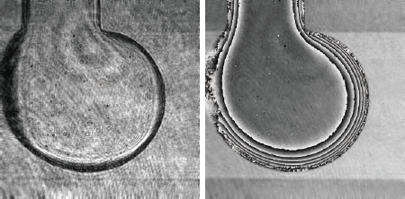 Fig. 3 Regenerated images at center height of the channel. Intensity image (left), and phase image (right).