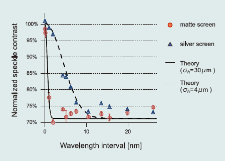 Fig. 2 shows the results of the experiment. The measured speckle contrasts of two lasers were normalized by the average speckle contrast of each laser. The solid and broken lines show the calculation results based on Eq. (1) with the surface roughness of 30 µm and 4 µm, respectively. We observed the significant difference in the dependences of speckle reduction on wavelength interval between two types of screen. Wider wavelength interval was required to reduce speckle on silver screen than on matte screen. The measured speckle contrasts were reproduced by the calculations when we set the effective surface roughness of matte screen as 30 µm and that of silver screen as 4 µm.