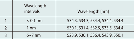 We measured the speckle contrasts on two screens illuminated by up to 5 lasers through a projector. An optical fiber bundle was set in the projector instead of a Xe lamp. Beams from the projector instead of a Xe lamp. Beams from the lasers entered into the projector through the fiber bundle. Two rectangular rod integrators were placed in the projector: one was the original integrator placed in the projector, and the other was added behind the original one. A ground glass diffuser was placed between the two rods. We used three sets of lasers of which wavelength intervals were smaller than 0.1 nm, about 1 nm, and 6~7 nm, and changed the number of lasers from one to five. Table 2 shows the wavelength list of each set of lasers.