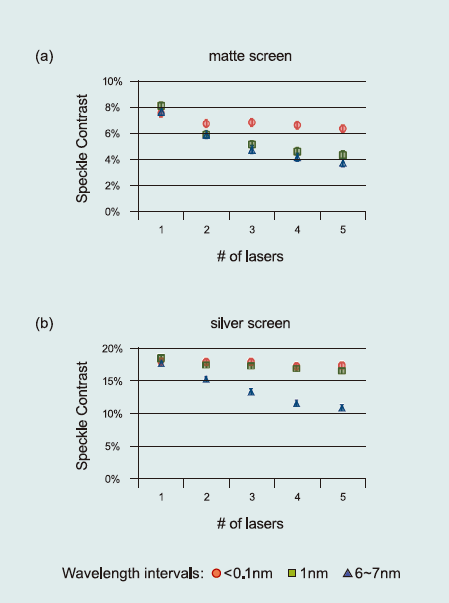 Fig. 3 shows speckle contrast dependence on the number of lasers. On matte screen, the degree of speckle reduction of 6~7 nm interval lasers was nearly the same as that of 1 nm interval lasers. In contrast, on silver screen, using 1 nm interval lasers had only a small effect on speckle reduction, but using 6~7 nm interval lasers reduced speckle significantly.