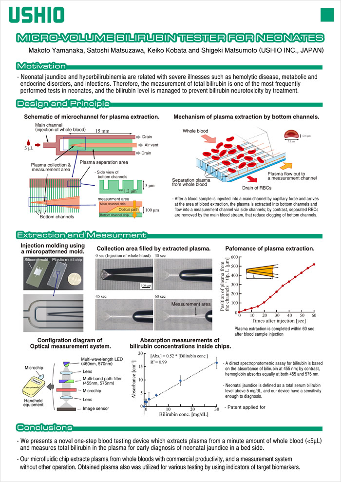 微量全血(<5μL)からの血漿抽出と黄疸計測をワンステップで行うことを可能とする、マイクロ流路チップを用いた新生児向け血液検査装置を開発した。