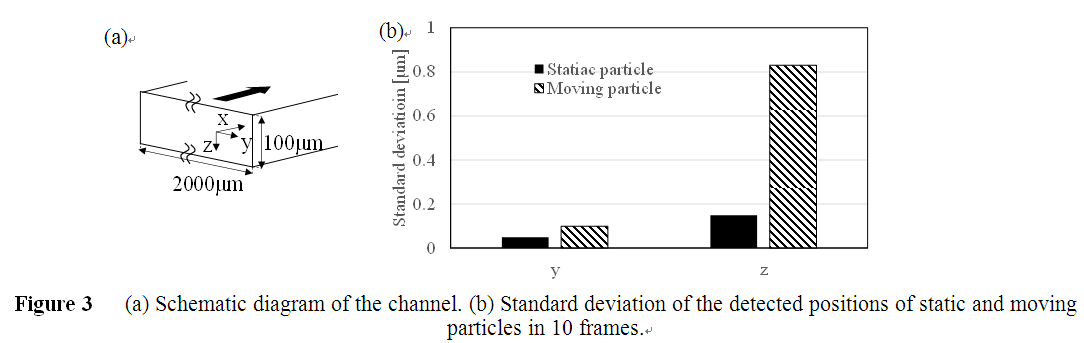 Using the phase based particle detection algorithm, Poiseuille flow in a microchannel was measured in 10 frames. The channel cross section was rectangular and the size was 2000×100 μm as shown in Figure 3 (a). The measurement volume was 226×226×206 μm. Figure 3 (b) shows the standard deviation of the positions of the particles in 10 frames. The error value was submicron order of both static and moving particles. However, the error of the moving particles, especially in the depth direction, was larger than that of static particles. It was considered that the moving particles produced more noise than static ones.