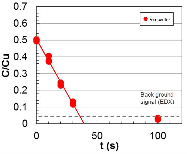 We investigated relations of the C/Cu ratio and the smear thickness.It is difficult for the thickness of the smear to measure it. We measured  average thickness of five points of center of via bottom from cross section SEM images in this report. From aresult of Fig. 5 and Fig. 6, the removal rate of smear by Photodesmear culclated with 11nm/s.