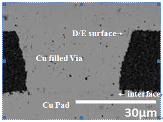 Via cleanliness and peel strength were evaluated by a pull test tool (Shimadzu EZ-LX). We used FE-SEM to determine the interfacing between Cu pads and filled via Cu. Surface roughness was measured by a laser microscope (Keyence Laser microscope VK-X160) and atomic force microscope (Keyence, Nano scale hybrid microcdopeVN-8010).