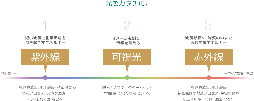 光で照らす、刻む、固める、洗うー。波長が違えば、その光が持つ特性も変わります。どの波長がどのような特性を持つのかを解明し、人工的に再現・コントロールすることで光をツールとして使いこなす。それがウシオの光技術です。