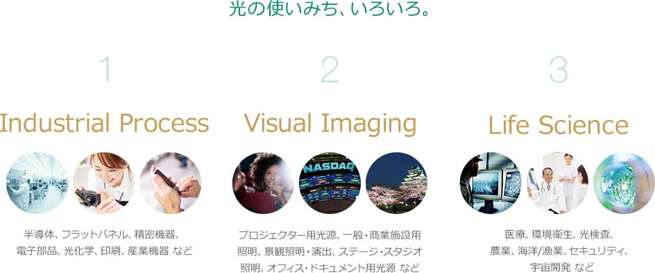 ウシオの光技術は、「あかり」の領域だけでなく、産業や科学技術の先端分野で「エネルギー」として幅広く利用され、数多くの高シェア製品を誕生させています。