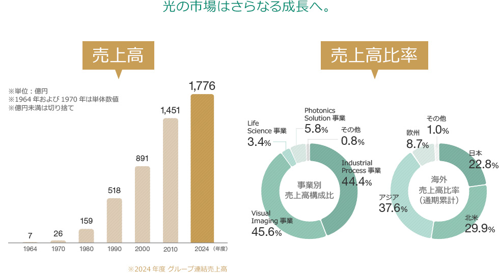 1964年、ウシオ電機設立。「光」を「あかり」としてだけではなく、紫外線を「光化学エネルギー」として、赤外線を「熱エネルギー」として利用することで、新しい光市場を創造する―。ウシオが信じたのは、光の無限の可能性でした。