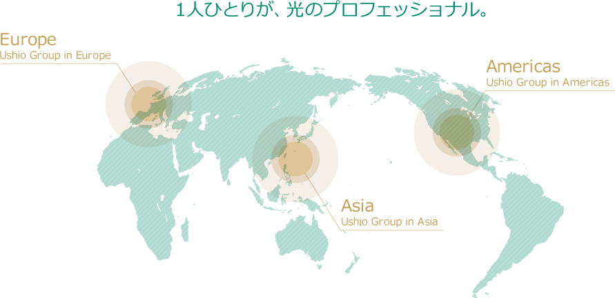 たとえば、スマートフォンの製造工場や医療活動など、いまや光は国境を越え、世界中に拡がっています。その国や地域で、必要な光を必要な時に。ウシオだからこそ、お届けできる「光」があります。