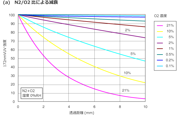 172nmの光は大気中で急激に減衰します。長波長側の光も、172nmの1/100程度出ています。本ランプは10cm以上離れれば、短時間であれば直視しても差し支えありませんが、ランプ点灯時に作業される場合は、保護メガネの着用をお勧め致します。