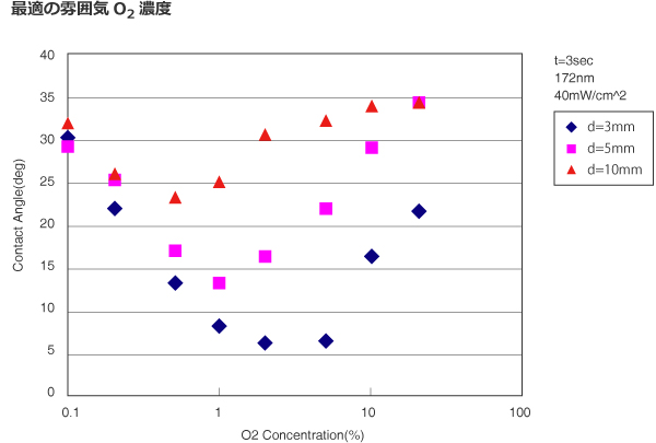 洗浄能力は照射物に到達する照射強度と照射物表面の活性酸素濃度に依存します。 GAPを取りすぎると照射物に光が到達せず洗浄が行われません。次ページにGAPと照射強度の相関図を提示致します。