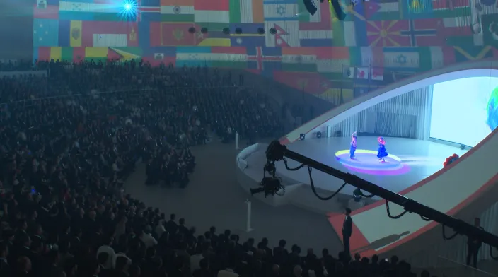 EXPO ホール「シャインハット」で行われた「閉会式」で、プロジェクションマッピングシステムを活用。