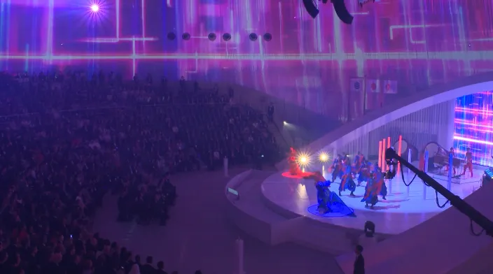 EXPO ホール「シャインハット」で行われた「閉会式」で、プロジェクションマッピングシステムを活用。