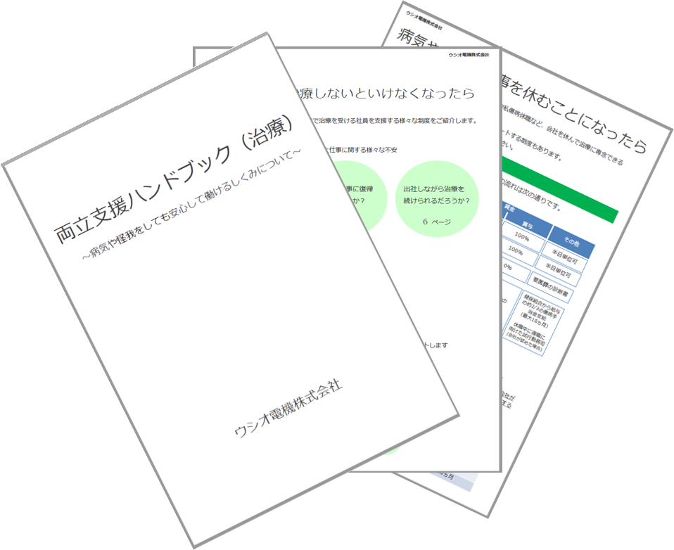 本年度は新たな取り組みとして、今、病気や怪我をしていなくても、将来、病気や怪我にかかった場合でも安心して働くことができる様々な制度について、社員にわかりやすく説明し、不安を解消してもらうことを目的として、「両立支援ハンドブック(治療)」を発行しました。